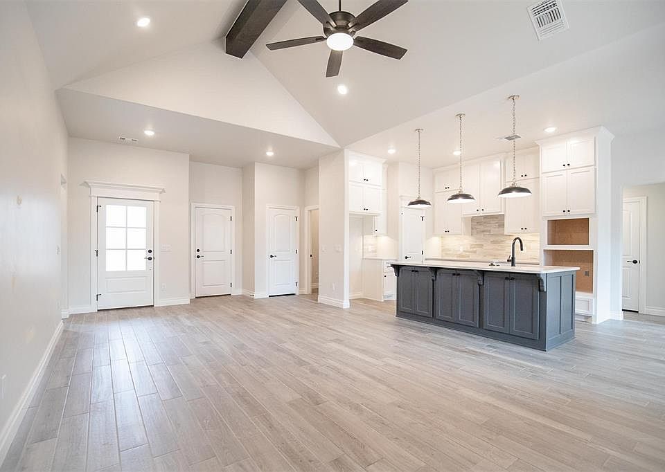 This Hummingbird floor plan features 2,025 Sqft of total living space, which includes 1,800 Sqft of indoor space and 225 Sqft of outdoor living. There is a 565 Sqft, three car garage with an in-ground storm shelter installed. This home offers 4 bedrooms, 2 bathrooms, 2 covered patios, and a large utility room. The great room welcomes a breathtaking cathedral ceiling, a gas fireplace with our stacked stone surround detailing, large windows, rocker switches throughout, wood-look tile, and Cat6 wiring. The high-end kitchen has 3 CM countertops, custom-built cabinets to the ceiling with cabinet hardware installed throughout and under cabinet lighting, stainless steel appliances, a 5-burner cooktop, vogue tile backsplash, stellar pendant lighting, a corner walk-in pantry, and a large center island equipped with a trash can pullout, work station sink, and dishwasher. The elegant primary suite has a sloped ceiling detail with a ceiling fan, windows, Cat6 wiring, and our cozy carpet finish. The attached spa-like bath includes a dual sink vanity with framed mirrors, TWO spacious walk-in closets, a roomy European walk-in shower, and a free-standing tub. Secondary bedrooms feature high ceilings with ceiling fans, windows, spacious closets, and carpeted flooring. The covered back patio offers a wood burning fireplace, a TV hookup, and a gas line for your grill. Other amenities include Healthy Home Technology, a fresh air ventilation system, a tankless water heater, R-44 insulation, and more!