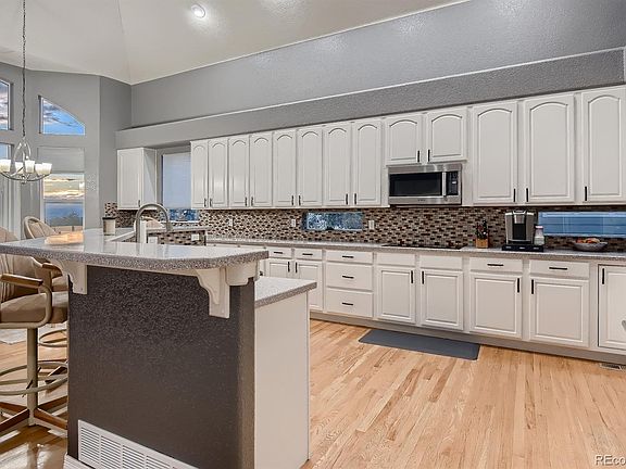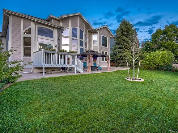 The home features vaulted ceilings, recessed lighting and a multitude of windows that keep it feeling open and bright at all hours of the day. The Formal Living and Dining Rooms usher you through to the Family Room appointed with grand windows, remote controlled blinds and a cozy fireplace. The open concept kitchen adjoins this massive family space and features an island breakfast bar, ample cabinet storage, top end Bosch S/S appliances, a center island  with an eat-in breakfast nook. This home has a MAIN FLOOR Master Bedroom with a newly remodeled master bath suite and a large walk-in closet complete with built-ins. Upstairs features three additional bedrooms 2 full bathrooms (one Jack and Jill) and a large loft that could be an office, den or additional family space.  The Laundry Room has been remodeled with plenty of cabinets, utility sink and new front loading washer and dryer, that are included.  The finished basement offers a large recreation room perfect for entertaining and features an entertainment center complete with a built in bar area, ceiling LED lighting, wired for sound and a newer pool table and large wall mounted flat screen TV… all included! The backyard is open yet private with a concrete patio, Trex deck and metal 12x14 Gazebo (included) to enjoy the majestic sunsets and unobstructed vistas of Front Range and Golf Course.