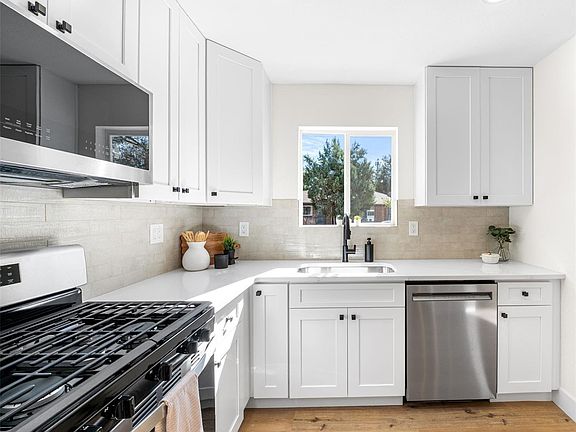 Welcome to this renovated ranch-style home that is full of charm, style, and comfort. Nestled on a desirable corner lot, this home has been thoughtfully updated from top to bottom, offering the ideal blend of character and contemporary living. Step inside and instantly feel at ease. The open, airy layout welcomes you with natural light, spacious rooms, and a warm atmosphere to suit your lifestyle. At the heart of the home is the stunning, fully redesigned kitchen. From the soft-close white shaker cabinets to the gleaming quartzite countertops, every detail has been carefully chosen. Breakfast bar seating, stainless steel appliances and tile backsplash complete the space. Just off the kitchen, the dedicated dining area features a south-facing window that fills the room with sunshine. The living room is equally inviting, with timeless coved ceilings, open plan living and durable LVP flooring that ties it all together. At the back of the home, discover your own private retreat in the newly redesigned primary suite. Thoughtfully situated for privacy, it features an en-suite luxurious bathroom with a barn door entry. Two additional bedrooms, updated full bathroom with a skylight, and the spacious laundry/mudroom adds everyday convenience with room for storage and organization. Throughout the home, you’ll find peace of mind with all the upgrades: new windows, exterior siding, doors, hardware, light fixtures, paint, and flooring — nothing has been overlooked. Outside, the home continues to impress. The private, fully fenced backyard is perfect for outdoor living with a covered deck and yard. The front yard has been professionally xeriscaped for low-maintenance curb appeal, and a new concrete parking pad adds extra off-street parking plus a spacious 2-car detached garage. Located in a well-connected neighborhood, you’ll enjoy easy access to parks, schools, restaurants, and the nearby Anschutz Medical Campus. This home is not just move-in ready—it’s ready to welcome you.