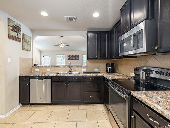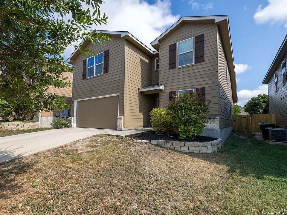 Nestled in the welcoming Laurel Mountain Ranch community-complete with a sparkling pool, playground, dog park, and its own elementary school-this home is ready to be your personal sanctuary. Fresh exterior paint sets the stage, while the interior offers a blank canvas to bring your vision to life. Step inside to an inviting, light-filled layout where the spacious dining room flows seamlessly into a kitchen with stainless steel appliances and a breakfast bar, then opens to a breathtaking living room with soaring two-story ceilings. The downstairs primary suite is your private retreat, featuring a charming barn door leading to the bath. Upstairs, three generously sized bedrooms with walk-in closets and a huge game room/second living area create the perfect balance of connection and personal space. Outside, a covered patio and cozy fire pit invite evenings under the stars, with a roomy yard for kids, pets, and laughter to roam free. All this, just minutes from JBSA Lackland, Loop 1604, and endless shopping, dining, and entertainment-offered at a value that's hard to resist.
