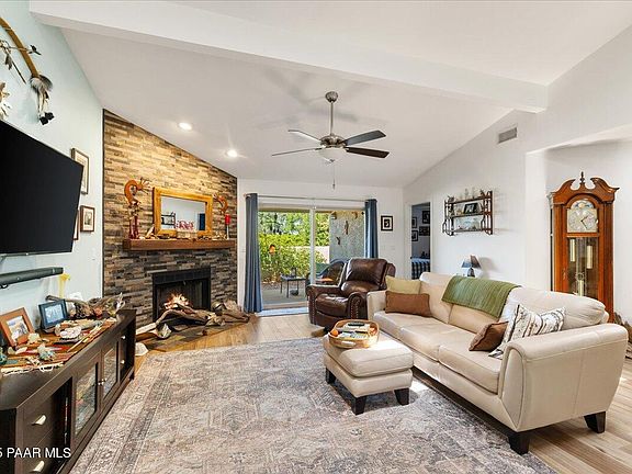 Nestled in the desirable Prescott Golf Club community, this fully remodeled townhouse is move-in ready and designed for both comfort and style. The exterior welcomes you with fresh updates, including a new roof (2020), lifetime warranty triple-pane windows, and a double-pane glass door that enhances energy efficiency while keeping the interior light-filled and quiet. The HOA further adds to the convenience by covering exterior maintenance of the unit, including the roof, along with the front yard landscaping and the sewer fees.Inside, the open-concept living area immediately impresses with its bright, airy atmosphere, highlighted by skylights that bring in natural light. A striking floor-to-ceiling stone-look tile fireplace with a walnut box mantle and slate hearth serves as the centerpiece of the room, adding warmth and character.The adjoining kitchen has been beautifully updated with new cabinetry, sleek granite countertops, and modern appliances, including a gas stove--perfect for everyday cooking or entertaining. Just off the living spaces, the primary bedroom offers a relaxing retreat, while the additional bedrooms provide comfort and flexibility for family, guests, or a home office. Bathrooms have been completely renovated with granite countertops, stylish vessel sinks, updated cabinetry, and new toilets, bringing a modern touch to every detail.Throughout the home, stylish vinyl plank flooring is complemented by a welcoming slate entryway, blending charm with durability. Gas heating, hot water, and the fireplace ensure efficiency and comfort year-round.Step outside to your private patio, an ideal spot to relax, sip your morning coffee, or enjoy an evening under the stars. With thoughtful upgrades, timeless finishes, and the ease of HOA-covered exterior care, this townhouse offers the perfect balance of convenience, quality, and easy living in one of Prescott's most sought-after golf communities. Rentals allowed of 90 days or longer.