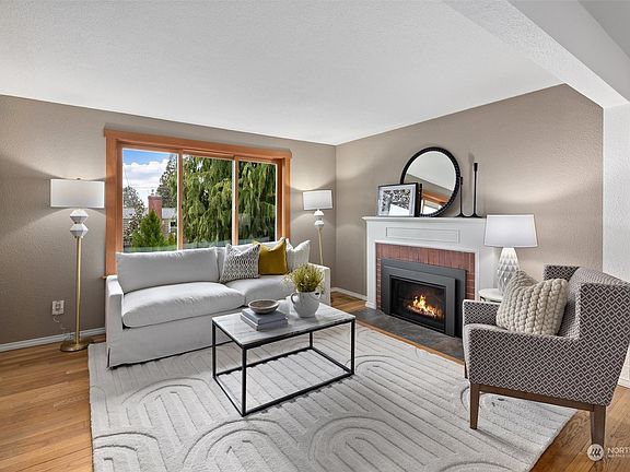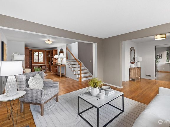 Welcome to this beautifully updated classic craftsman in the heart of Broadview! This charming home boasts hardwood floors, several built-ins, formal dining room, library/sitting area, cozy gas fireplace, recreation room with wet bar, primary suite with walk-in closet, craft room, office or 4th bedroom downstairs, flex space for workout room, entertainment sized deck with gas line for bbq & fireplace. Views of the Sound and mountains. New bathroom downstairs was just added in 2023. Peaceful sunroom provides retreat to relax overlooking the large backyard and gardens with fruit trees and 45+ plants & flowers. Garage with possibility for ADU. Great location and neighborhood. Don't miss the opportunity to make this your dream home!