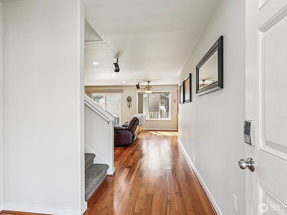 Welcome to this well maintained home with central A/C and plenty of room for entertaining. This 4 bedroom 2.5 bath plus den is loaded! Easy quick access to I-5 and 512. Features include wood floors, white painted mill work, decorator tile on kitchen counters with full height back splash, laundry room tile floors, tile bathroom counters, floors and shower. Stainless steel kitchen appliances. Front yards maintained by the HOA. Gas fireplace with tile surround.