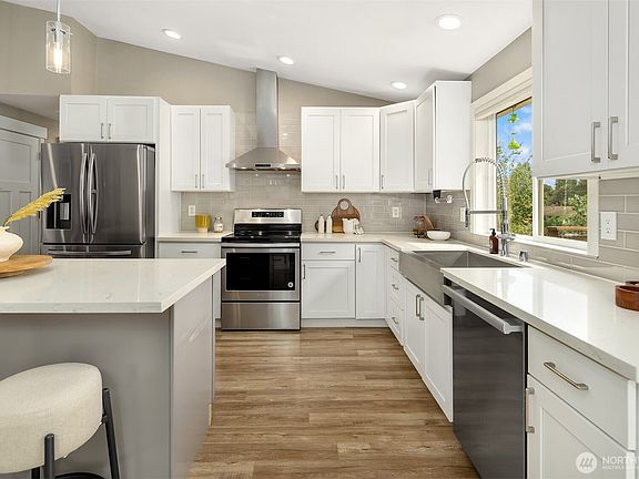 Thoughtfully remodeled turnkey home with an open-concept design, vaulted ceilings, custom railing, and a warm cedar entry. The stylish kitchen features a large island great for hosting. Enjoy seamless indoor-outdoor living with a beautiful deck, newly added back patio, and a generous backyard. The lower level provides a flexible office & entertaining space. Nestled between Northgate & Pinehurst, the home sits in a quiet community near Hazel Wolf School, with easy access to parks, shops, and local amenities. Just over a mile away, the Northgate Light Rail station and major neighborhood redevelopment, including the Seattle Kraken practice facility, enhance both convenience and connectivity.