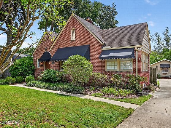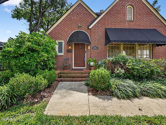 New roof installed 2nd week in Oct. Charming 1930's home close to the San Marco square, Granada Park & Hendricks Elementary. The curbside appeal of the beautiful brick w/the front facing awnings at the windows & door is pleasing to the eye. Many updates including renovated kitchen & baths. High ceilings & original hardwood floors throughout. Slate flooring in bathrooms & laundry room. Wood burning fireplace in living room adds a sense of warmth all year long. Arched openings brings a classic style to this home. Entire house is light & bright. Large, private backyard with screened patio. Additional 400 sqft in detached cottage which includes a living room, bedroom, and half bathroom with tile floors. This is perfect flex space for a number of uses including a guest suite, a home office, gaming room, man cave, or she space. Parking available behind the fence is available. The new screened patio to relax & enjoy. Front bedroom w/ attached wardrobe would make a great home office as well.
