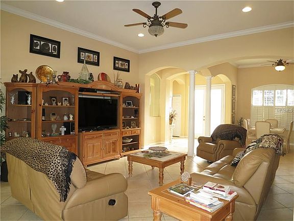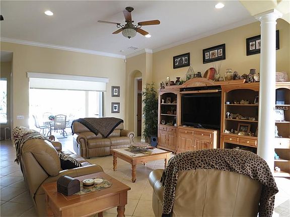 Medallion built 3 bedroom, 3 bath, 3 car garage home. Great for entertaining, this home has ample size rooms. You''ll be impressed when you enter through the double edged door entrance that leads you to a grand living room with columns, vaulted ceiling and crown molding. Roomy dining area has custom made plantation shutters for the arch window. The great room have large ceramic tile, set on the diagonal and sliding glass doors that open to show you the covered lanai area, outdoor kitchen and your spacious fenced back yard. The kitchen has stainless steel appliances. Plenty of storage with lots of drawers, a pantry and wood cabinets. Corian counters and breakfast bar oversees large breakfast nook where you can enjoy your coffee in the morning and enjoy views of your back yard through aquarium window. The master bedroom is oversized and has 2 walk-in closets and sliding glass doors leading to the lanai. Master bath has walk-in shower and garden tub. Separate dual vanities & water closet for privacy. Office/den has glass doors and sliding glass door access to the lanai. Split floor plan home. 2 others bedrooms with carpet and a good size second bathroom with a tub/shower combination. You''ll enjoy the privacy of the wood preserve behind the home. Central Vacuum system in the home. Home offers double side entry garage and separate single garage. River woods offers a community center with gym equipment, a community pool & tennis courts. Please note that the home is being sold "As Is".