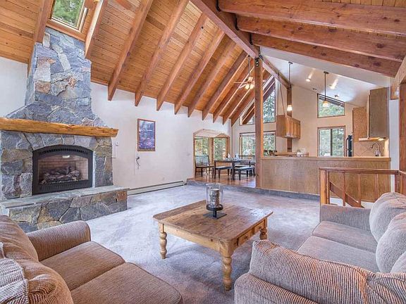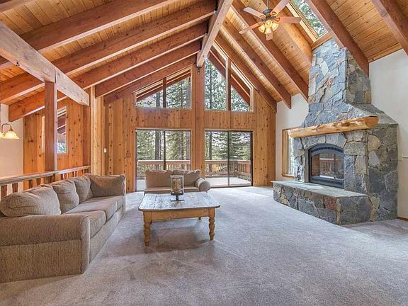 Classic Mountain style home with soaring ceilings with massive lam beam and a wall of windows that lets the forest in the living room. Centerpiece of this great room is a floor to ceiling Truckee Native Stone fireplace with hand cut and fitted stones and hand finished log mantle. This elegant but rustic has an efficient Extrodinaire gas fireplace that runs on thermostat maintaining a cozy temp. Bring the family and friends to this Mountain home where there is plenty of room to gather and to retreat.