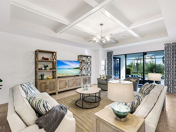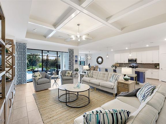 Step into this stunning modern coastal retreat, where bright open spaces, elegant finishes, and timeless design come together to create the perfect home and Southwest Florida Lifestyle! Every detail of this exquisite Summerville has been thoughtfully curated from coffered ceilings at the entry and living, to custom window treatments and designer fixtures which result in a space that feels both luxurious and livable! The gourmet kitchen is the heart of the home featuring white shaker cabinetry, granite countertops, subway tile backsplash, and a massive, bold navy island that adds coastal flair! Primary suite showcases a warm LVP flooring, tray ceilings and trim accents, and has direct access to the lanai! Expansive sliders make way to the outdoor private retreat and saltwater pool with peaceful preserve view--ideal for entertaining or relaxing under the Florida sky! This home features a Culligan Water Softener and Reverse Osmosis, High Wind Roll Down and Accordion Shutters, and other conveniences like built-in cabinetry and laundry sink. Sophisticated yet relaxed, and has been meticulously maintained, this home is truly ready to move in, live, and enjoy! If that's not enough, take your golf cart to the clubhouse resort, where it's a vacation every day! A lifestyle director brings the restaurant bar & grill and resort pools to life with calendarized social events and activities! Other amenities include 2 separate gyms, saunas & locker rooms, full court indoor basketball/volleyball court, arcade, social hall, 4 pickleball courts, tennis courts, playground, putting green, event lawn, splash pad, 2 bocce courts, sand volleyball court, firepit and more! Quick access to I75, airport, Jet Blue Park, and all the daily stops and convivence along the Daniels and Colonial Corridors! There's truly no place this like place, and no home like this home!