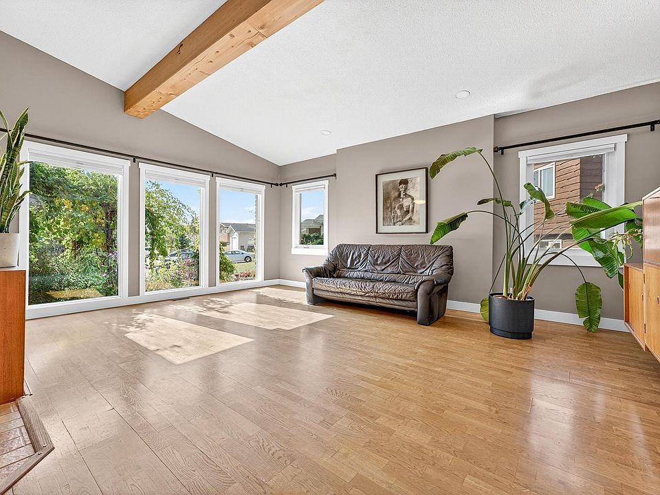 This UNIQUE mid-century modern bungalow is more than just a home. Lovingly built & maintained by its original (sole) owner, every detail reflects craftsmanship, timeless style, & enduring quality. The open-concept floor plan is enhanced by cedar plank ceilings, exposed beams, & 8’ doors that create a sense of space & light. Custom cabinetry, built-in shelving, & architectural room dividers add both function and artistry, while high ceilings extend into the basement, offering flexibility for future dreams. With 5 bedrooms, 2 3pc baths and 4pc ensuite, a custom kitchen island, & generous shared spaces, this home was designed for both daily living family/friend gatherings. Practicality meets innovation with an 11.6 kW solar array (2021) generating ~10,000 kWh/yr. The heated (tandem) 4-car garage features HIGH CEILINGS, oversized windows, dual faucets, & electrical panel ready for an EV charger. If you’re searching for a home to grow into and cherish, & lover of beautiful outdoor spaces, this is it.