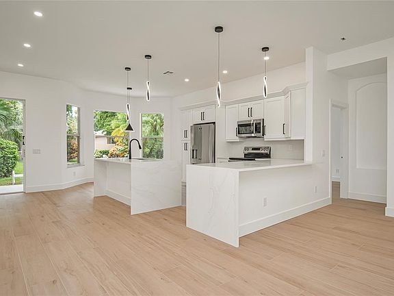 Modern, contemporary and spacious living at its finest! Be the first to move into this stunning, fully renovated 2025 home located in a vibrant 55+ community! Designed with elegance and comfort in mind, this home features wood like tile flooring thruout, a chef inspired kitchen with white quartz counters w/soft grains running thru, sleek white cabinetry and contrasting black hardware for a bold, modern look.