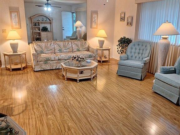 SUBSTANTIAL PRICE REDUCTION 10/2025!! Welcome to this charming and spacious 2-bedroom, 2-bathroom, 1 car garage home located in the highly desirable 55+ Oak Run Country Club community. The home is being sold FURNISHED...great for a part-time or year round lifestyle!! This home features a nice front porch to enjoy your morning coffee. Upon entering the home you will notice the open floor plan offering Living Room/Dining Room combination perfect for gatherings with family and friends. Recent updates include beautiful newly installed (August 2025) porcelain tile flooring in the kitchen along with Whirlpool/LG appliances (May 2025), wood laminate flooring installed a few years ago in the living room, dining room and hallway, A/C 2019 and Roof 2002. When you're ready to relax enjoy your enclosed Florida Room (under heat/air), but you may prefer to sit on the adjacent screened in lanai instead!! Finally, there is a separate patio for days you may want to host a BBQ...The Master Bedroom is a nice size with a walk in closet and ensuite bathroom which features a walk-in shower and vanity. The spacious guest bedroom offers a sliding door closet and is located across the hallway from the guest bathroom which includes a tub/shower combo and vanity. Oak Run offers a restaurant, golf course, dog park and other great amenities ie. 6 pools, 5 hot tubs, fitness centers and much more...there are over 110 clubs to join!! You will be close to restaurants, shopping and medical facilities in the area. **Oak Run is not an actual HOA community, therefore the monthly service fee doesn't go to an HOA. Please refer to Oak Run's website for details** GREAT HOME offering comfort and style located in a great neighborhood...see it today!!