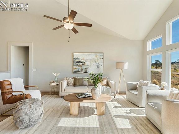 EXCEPTIONAL VIEWS * CUL-DE-SAC * 4-CAR GARAGE * OAK FLOORING * LOW MAINTENANCE LANDSCAPING * ACCESSIBLE WALKING TRAILS * NINE FOOT BASEMENT CEILINGS * OPEN FLOOR PLAN *UPGRADED ENSUITE BASEMENT BEDROOM * AC * GRANITE COUNTERTOPS * MULTIPLE BUILDER UPGRADES * PET-FREE HOME * PRIVATE LOT*COVETED BASEMENT STORAGE Nestled in the heart of The Farm community, this custom home with a Vanguard Brentford floor plan has a modern farmhouse aesthetic which shines from top to bottom. This special lot is located at the end of the cul-de-sac with walking trails accessible from both the front and rear of the property. One can appreciate the dynamite Front Range views from both inside and outside the home. The wonderful floor plan is warm, inviting and lends itself to elevated casual living amongst friends and family. The open kitchen will dazzle with an expansive island, built-in cabinets, and gorgeous granite countertops. This all flows seamlessly into a perfectly appointed dining area with windows overlooking the Air Force Academy and Pikes Peak. In the great room, dramatic ceilings and floor-to-ceiling windows create a stunning setting and capture the mountain views, mature pine trees, and native grasses. Walk out to the back patio along natural Colorado stone pavers to enjoy the mountain views year-round; in the summer, listen to the creek that runs under the bridge. The primary owners' suite with a walk-in shower and oversized soaking tub will make for a special retreat. Unlike most ranchers, this home boasts two additional bedrooms on the main level. Meander to the basement and the options become endless in this space. The ensuite bathroom downstairs ensures family or friends can have privacy when visiting. Many special features include a coveted 4-car garage, garage hose bib, 220V EV charger, 2nd full basement bathroom, LED lighting, laundry room sink and more! This home is in excellent condition and walking distance to coffee shops, parks, and restaurants.