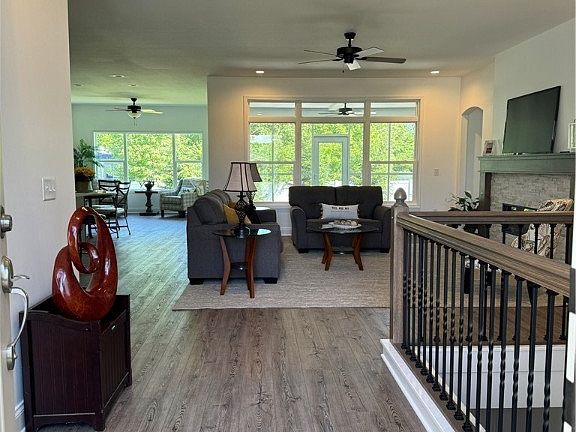 Open floor plan with lots of cupboards and large walk in closets .Coretec vinyl plank flooring in entry, kitchen, greatroom, dinette & sunroom. Kitchen has large island w/ seating, quartz tops, walk in pantry. Slide in electric range, with vent, built-in microwave. Dinette & sunroom flows out to a 17x15 screened porch and a ground level patio. Mstr bath has his/hers vanities & make-up area, custom tile shower, private stool and big walk-in closet! Home has 9 ft ceilings and 42 in upper cabinets. Electric fireplace with stack stone. 3 car garage, high eff furnace & large partial basement.