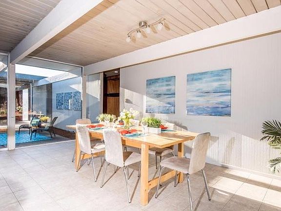 This famous Eichler home sits at the end of a quiet street, facing east, on a 10,000 sq ft lot with beautiful redwood trees and a large, open backyard.