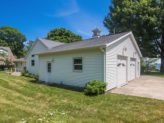 Old Mission Peninsula! Private Waterfront on East Bay located on quiet and desirable Bluff Road. Enjoy the private beach, kayaking, paddle boarding, boating and fishing. Large covered front porch to enjoy the view of the water and sunrises. This beautiful 3 Bedroom, 3 bath year-round home features a large primary suite w/large walk-in closet and bath, plus a second primary bedroom with a private bath at the other end of the home. A Family room and a living room, gas fireplace, nice kitchen and dining. Main floor laundry with sink and storage. Nicely landscaped lot with a deck and patio area. Full Basement with a Bilco Door to the back yard, a root cellar and a utility sink. 816 sq. ft. oversized finished garage with hot and cold water, work bench. Near restaurants, wineries and convenient Peninsula Market. Well maintained and move-in ready, plenty of room for family and friends!