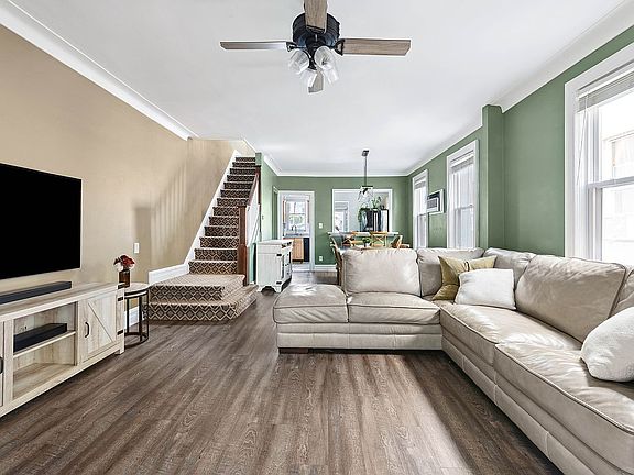 The 2nd floor has 3 large bedrooms and a renovated windowed full bath. The primary bedroom could even be split into 2 allowing for 4 upstairs bedrooms. High ceilings, and hardwood floors run throughout the home. There is abundant closet and storage space as well.