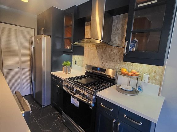 Modern, move-in ready 1BD/1BA with balcony in gated Brentwood Villas. Sunlit, north-facing, single-level home features an open living/dining area finished in oversized marble-look porcelain tile, crown molding, recessed/track lighting, and a ceiling fan. Designer kitchen with white quartz counters and a waterfall peninsula for stool seating; full-height travertine backsplash; custom dark cabinetry with glass uppers; matte-black faucet; double-bowl sink; pantry/utility niche; and a stainless appliance suite including a 5-burner gas range with chimney hood and dishwasher. The spacious bedroom offers bamboo flooring, a ceiling fan, and a walk-in closet with built-ins. Updated bath showcases a floating vanity with LED mirror, stone mosaic tile, and a tub/shower with glass enclosure. In-unit stacked laundry behind louvered doors. Private balcony overlooks a tree-lined street—perfect for morning coffee. Community amenities include a pool, dry sauna, renovated fitness center (2020), secure lobby with elevator, and gated entry; HOA includes earthquake insurance. One assigned gated parking space.