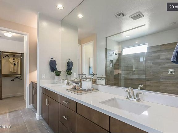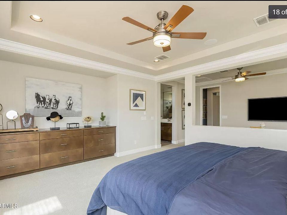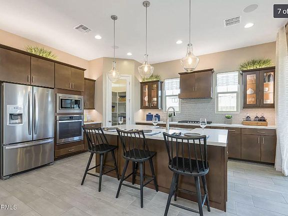 Highly upgraded former model home in the heart of Chandler with 4 bedrooms + loft & 3 baths in 2519 SqFt. Great room floor plan with one bedroom & bath on the main level, perfect for guests! The gourmet kitchen has a gas cooktop, stainless appliances, walk-in pantry & island with breakfast bar & pendant lighting. Sliding doors lead out from the great room to the wrap-around covered paver patio and backyard with artificial turf. The owner's suite is upstairs and features a coffered ceiling, sitting room, & en-suite bath with huge walk-in shower, dual sink vanity and walk-in closet with built-ins. The laundry room is conveniently located upstairs and has upper/lower cabinetry & sink. Other features include 8' interior doors, soft water loop, exterior gas stub for your BBQ, and fabulous community pool, spa and fitness center. See today!