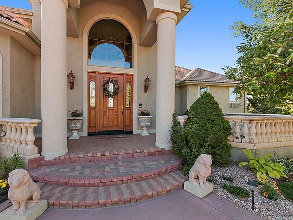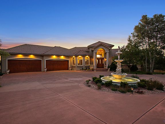 For direct information please call Larina at 720-275-9663! Welcome home to a truly unique and rare treasure. Situated in the prestigious neighborhood of Centennial Ranch, this spectacular European inspired home is a countryside gem. Situated at the end of a quiet cul-de-sac, this home offers over three and a half acres of pristine landscaping with water features; two fire pits; a basketball court; flagstone walkways, perennial flowers and mature trees. Enjoy an outdoor dining experience under the pergola's bistro lights by the waterfall or under the covered lower floor patio. These numerous entertaining spaces including the front patio beyond the French doors as well as the upstairs deck, allowing your friends and guests to experience the outdoors to its fullest while taking in the 180 degree views of the Colorado Rockies. The property is fully fenced with a beautiful private gated entry where you are greeted by a three-tiered water fountain as you enter the roundabout. There is plenty to keep you entertained any day of the year with a huge amount of open space for your friendly game of summer volleyball or soccer in the field and room for expansion to create whatever your heart desires. The expansive interior of the home offers an open floor plan with a main level deck and fantastic two story windows that peer out to four of Colorado's 14'ers. The luxurious master suite is located on the main level with a west facing sitting area that accesses the main level deck. Enjoy the giant master closet, jetted tub and large multi person steam shower. Designed by an engineer, the home was carefully thought out and designed to take full advantage of the mountain views from all areas of the home; including the formal study/library, kitchen, living room and master suite. Sensational Tuscan and marble finishes adorn the home from the large pillars that grace the two story entry to the custom marble floors and travertine finishes throughout. All doors are kiln dried solid oak in Spanish style. The open living room, kitchen and breakfast nook join together offering the perfect entertaining space centered around the majestic floor to ceiling custom finished fireplace and a large center kitchen island. Skylights and very large windows allow lots of natural light from morning until sunset. The home also boasts 2 18 feet wide cedar wood garage doors for 4 car storage and lots of extra space. This home offers an additional flex space that can be used as a working office or converted into a mother-in-law suite, additional bedrooms or bonus room. An 880 bottle wine room with raised plaster ceiling and theater room to seat 9 people. The possibilities are endless. Centennial Ranch is a flourishing community whose popularity has increased exponentially year after year due to its perfect balance of convenience and privacy. The location offers quick and easy access to C-470, I-25 and is located just minutes from all the luxuries and conveniences of city living. Downtown Parker's Main street is just 7 minutes away where residents can enjoy lavish dining, shopping, entertainment and annual celebrations. The PACE Center, local library, state of the art hospital and higher education schools are all in close proximity offering a wide range of activities for all ages. Downtown Denver and DIA are only a 30 minute drive making this neighborhood highly desirable due to the thriving city of Denver, its suburbs and the Metro areas expanding population. Words from the owner: "Yes, you can watch deer in your yard, sip wine at your fire pit in total privacy, marvel at the sunset and then be downtown Denver in 30 minutes. The best of both worlds" Visit: www.CentennialRanchHome.com