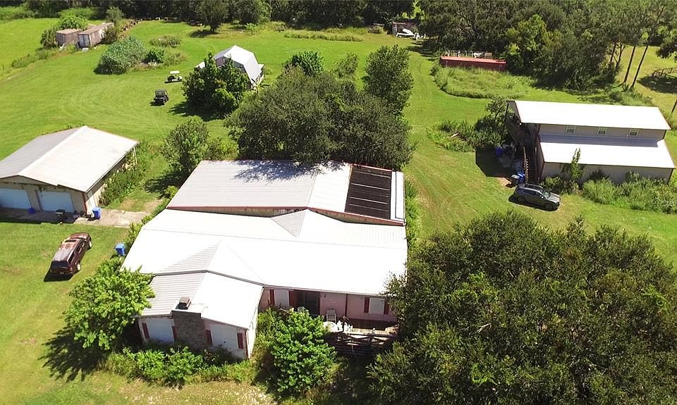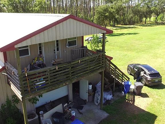 5-acre property in South Hillsborough County, Florida, located in Flood Zone X, featuring a Palm Harbor Triple Wide home in need of TLC. This unique estate, bordering ELAPP land for ultimate privacy with no backyard neighbors, is perfect for someone ready to restore its potential. The main home offers 3 bedrooms, 2 bathrooms, a split floor plan, a fireplace, and a spacious 66x30 screened back porch with three levels and an inground fiberglass pool. Additional features include an oversized double car garage, a large 45x50 workshop with a 2-bedroom, 1-bath apartment upstairs, currently occupied. The property also includes "The Hacienda," a 25x20 barn-style building with a kitchen/living area downstairs, a bedroom and bathroom upstairs, a front porch, and all appliances including a washer/dryer. A U-shaped pond and two gated driveways enhance the property’s appeal. Ideal for a family compound! Sold As-Is; the seller believes all building permits are in order, but the buyer must verify zoning and permit compliance. A must-see opportunity! Metal roofs were put on the main home and Hacienda approx. 7 years ago. ALL roofs are metal roofs! Upstairs tenant shall not be disturbed until signed contract is in place. Stack washer/dryer belongs to tenant and does not convey. There is a set downstairs, in the workshop for that unit. This property has so much potential!!! All measurements are approximate.