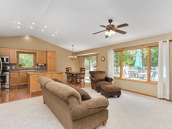 The search is over! Check out this fabulous rambler nestled in the trees on 2.5 acres. Ideal for home business or hobbyist! 4BR, 3BA, vaulted main level, center island kit, SS appliances, hdwd floors, tons of storage, T & G finished LL w/corner stone front fplc, covered front porch, maint free decking w/above ground pool, 3 car garage plus a huge heated 4 stall det wkshp complete w/floor drains & power plus unfinished lofted area. Bring the toys and enjoy this beautiful private setting.