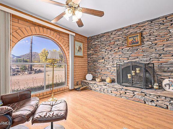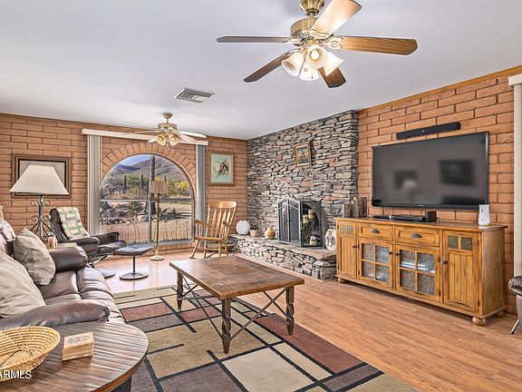WOW! CAPTIVATING 2809 ACRE LOT WITH MOUNTAIN VIEWS! This gorgeous residence w/large air conditioned workshop/2 car garage is a dream come true! Discover an inviting interior showcasing upscale light fixtures/ceilings fans, tile flooring in all the right places, trending palette, & abundant natural light. Stone fireplace in the spacious great room. Fully-equipped kitchen displays ample cabinets, tile counters, an island with a breakfast bar, and sliding glass doors to the backyard. Continue onto the quaint main retreat offering wood-look tile floors, an impeccable ensuite with dual sinks, & freestanding tub. Fall in love w/the resort-style backyard with covered patio, seating areas, fire pit, sparkling blue pool, & a hot tub perfect for relaxation.