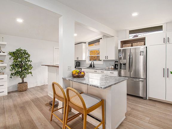 This bright, single-level home features hardwood floors, brand-new bedroom carpets, and an airy layout filled with natural light. The open-concept kitchen features granite countertops, custom cabinetry, and island seating ideal for everyday living and entertaining.