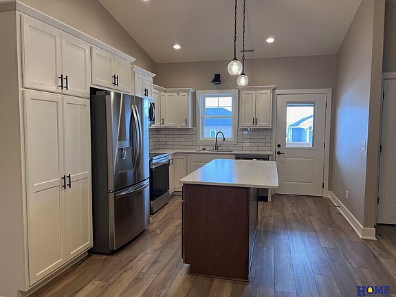 Don't miss this steal...priced BELOW the assessed value! It is a perfect package for simplified living and easy maintenance. This barely lived-in townhouse is designed for easy living and accommodation with no steps and low threshold doorways. The exterior is attractively designed with a quaint covered front porch, dormer window, cultured stone, and hardboard siding. The interior was redesigned to have an open floor plan with cathedral ceilings between the living room, dining room, and kitchen. The one-level living has 3 bedrooms, a full main bathroom, and a private primary bathroom with dual vanity, Quartz counters, and a walk-in shower. The kitchen features painted cabinets, a large island, Luxury Vinyl Tile flooring, quartz countertops, full tile backsplash, and stainless steel appliances. Enjoy beautiful Nebraska sunsets from the back-covered deck. Don't miss out on the great buy of this new home!