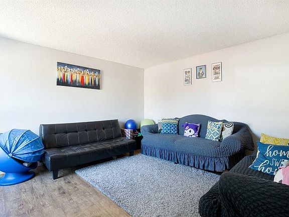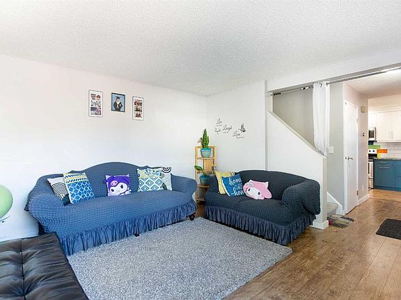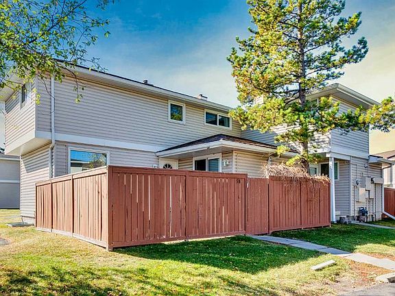 Welcome to Falconridge Estates. This end unit townhome offers an affordable way to stop renting and start building equity. Pride of ownership is clear with many recent improvements including new energy efficient windows throughout and updated laminate flooring on the main level. The refreshed kitchen features stainless steel appliances, custom cabinets, and a stylish backsplash, and opens to a spacious dining area with new sliding patio doors that lead out to the private fenced yard. Upstairs you’ll find two generous bedrooms and a full bathroom. The basement adds even more value with an additional permitted bedroom complete with a large egress window, a laundry area, and extra space waiting for future development. This well run complex is close to schools, shopping, and transit, all within walking distance. An assigned parking stall is included, and the fenced yard provides a great outdoor space for kids or adults to enjoy.