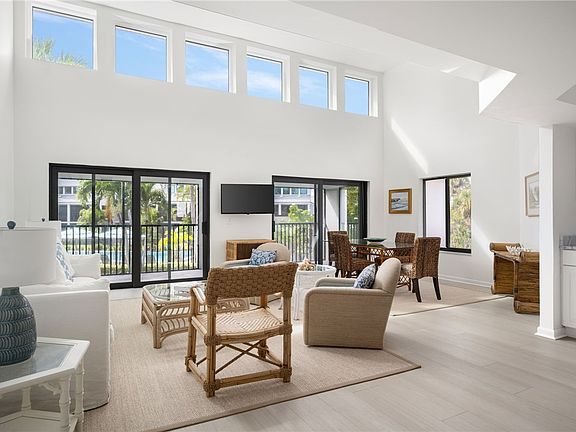 Ideally located east of A1A and across the street from the Moorings private beach access, this 2nd floor walk-up has been tastefully renovated w/new flooring, updated baths, kitchen opened to living areas; freshly painted to be ready for your seasonal or year-round use. Vaulted ceilings in living room, dining area & primary bedroom provide ample natural light, plus a covered screen porch overlooks the community pool. 2021 AC, 2022 HWH. Residents of Windward enjoy a heated community pool, carport parking and access to The Moorings private beach. 1 pet up to 50-lb. allowed with board approval.