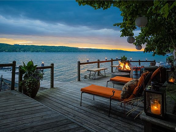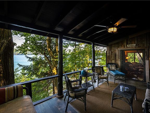 Welcome to Lucky Stone Lodge, a peaceful haven on a private cove w/ 250’ of pristine lake front, 4 bedroom Adirondack Lodge, gorgeous boat house & 4.3 acres of private woodlands. Perfect for gatherings, nights under the stars, relaxation & making memories. The east side location provides waterfront sunsets while the converted boat house offers room to entertain & extra sleeping space for guests. The main house w/ expansive porch & side deck, combined w/ the massive waterfront deck & boathouse, offers 2 exceptional lake experiences in one. The property has been lovingly restored to maintain the original charm of the Adirondack-style character (diamond pane windows, wood flooring, stone fireplace), while adding modern amenities & conveniences (new kitchen appliances, renovated bathroom, high-speed internet in main house & boat house). The main house can comfortably sleep up to 10, with additional sleeping space in the boat house. The private woodlands has a yoga platform nestled among the trees for another quiet spot to enjoy. Offering one of the most expansive waterfront living opportunities on the lake, Lucky Stone Lodge is truly like having an exclusive resort all to yourself.