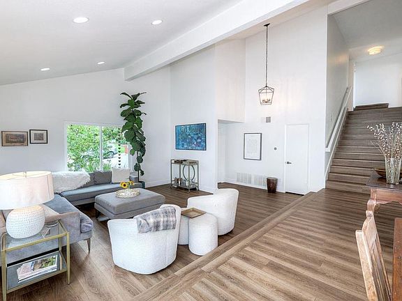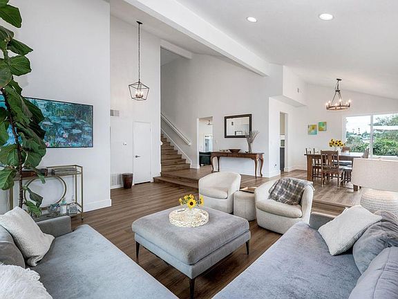 Beautiful Solana Beach house with recent interior remodel completed. Fantastic floor plan consisting of three bedrooms upstairs including a spacious primary suite plus one bedroom/office and bathroom on the main level. Enjoy soaring vaulted ceilings, an extra wide staircase and wood flooring in this sunlit home. The main level consists of a living room, formal dining area and comfortable family room with a fireplace. Updated gourmet chef's kitchen, beverage fridge, induction stove cooktop, extra kitchen storage and a Zip hydro faucet for instant boiling, chilled & cold sparkling water. This light and bright home has energy efficient windows and sliding doors. Nature abounds in the sunny garden with eco-friendly landscaping, updated hardscape, a fenced backyard and a pet safe screen enclosed catio. West facing sunset views and ocean breezes delight. House is located on a cul-de-sac street. Nearby San Dieguito Park, Lomas Santa Fe County Club, schools, walking/hiking trails, restaurants, shopping on Cedros Avenue and the beach at Fletcher Cove.