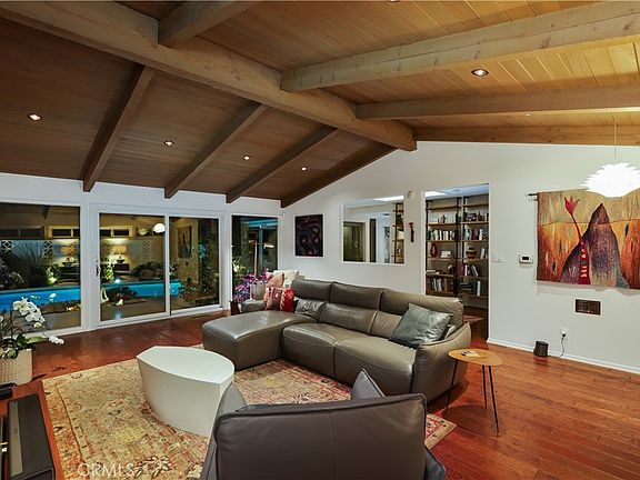 The home retains iconic period features—extra-wide front door with center knob, walls of glass, open beam ceilings, and a striking stone fireplace—while enjoying the benefits of a full modern remodel. The kitchen has been completely redesigned with custom finishes, while all three bathrooms have been luxuriously updated. New energy-efficient Anderson windows and sliding glass doors bring in abundant natural light and an open feel to the private pool for a true indoor-outdoor lifestyle.