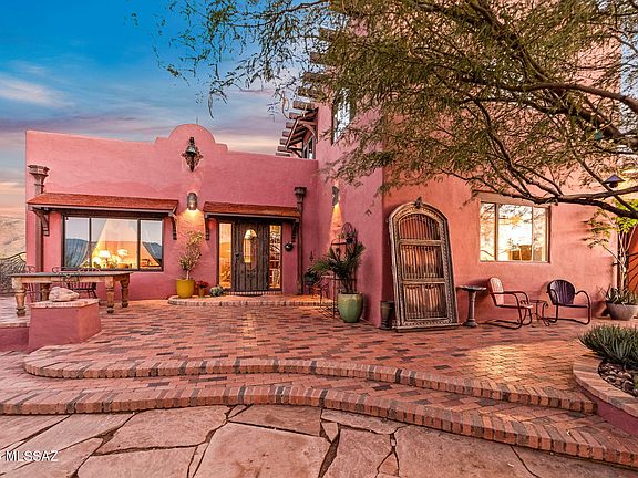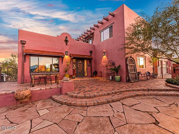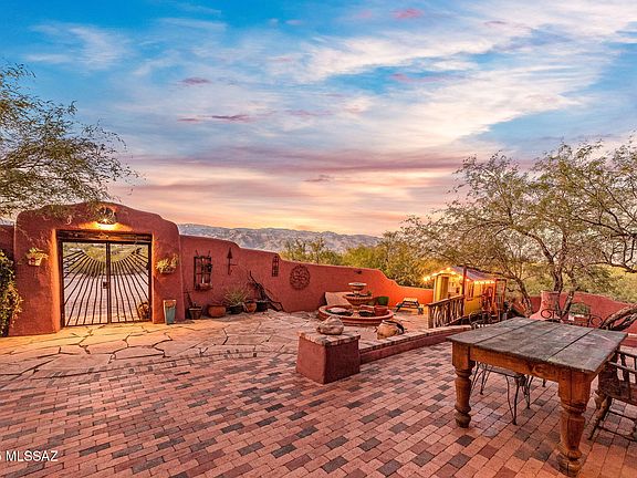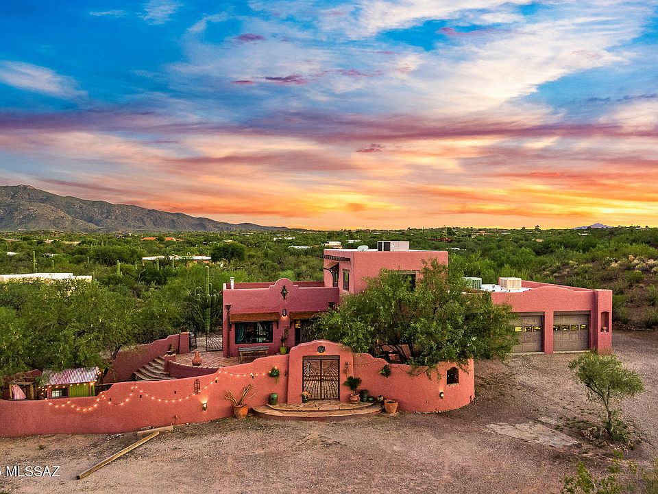 Experience the beauty and tranquility of this one-of-a-kind Southwest-style home on 5 lush acres surrounded by mountain scenery. Enjoy panoramic views of both the Rincon and Catalina Mountains, with sunsets that feel straight out of a painting. The main home features 3 bedrooms and 2 bathrooms, showcasing warm wood beam ceilings and timeless character. The primary suite spans the entire upper level, showcasing breathtaking views from it's own rooftop deck, while two bedrooms and a full bath are located downstairs. A large breezeway connects the main house to the guest studio and oversized garage/workshop. The guest house offers its own laundry, a large storage room below, and a private balcony perfect for sunrise and sunset viewing. Zoned for horses and free from HOA restrictions, this property offers endless possibilitiesadd a pool, expand the footprint, or simply enjoy the space as-is. The front courtyard is a serene retreat surrounded by mature vegetation and mountain viewsan ideal setting for peaceful mornings or entertaining under the stars. A true sanctuary; Perfect for cyclists, artists, or multi-generational living just five minutes from Saguaro National Monument East and less than ten minutes to Houghton Northwest Hospital, shopping, dining, and entertainment.