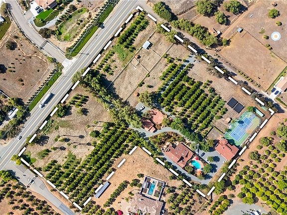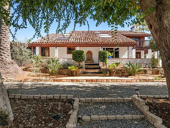 With a rare blend of old-world charm and modern amenities, this hacienda style estate brims with history, grace, attention to the details for fine living, entertainment and enjoyment of the land. The main house showcases classic hacienda elements plus a generous guest house provides a comfortable stay for visitors. Nestled on over 6 lush acres, everything was designed for unforgettable gatherings. The expansive entertainment pavilion features party rooms, a kitchen, bathroom and bar. Host lively events on the dance floor, dine under ambient lighting, or enjoy live performances on the built-in stage. Stroll through your own flourishing grove of delicious Valencia oranges and passion fruit irrigated by your private well. Tend to your horses or farm animals at the nearby corrals. Grab a game at your private sport court and a swim afterwards in the refreshing sparkling pool. Eco-conscious solar panels are owned. Find dedicated parking and hookups for your RV next to a custom deck. The private gated entrance and beautiful tree lined driveway is timeless and impressive. Whether looking for a private oasis or a family compound, hobby farm or expand your crop, tend to a horse or buy another, this stunning property has it all.