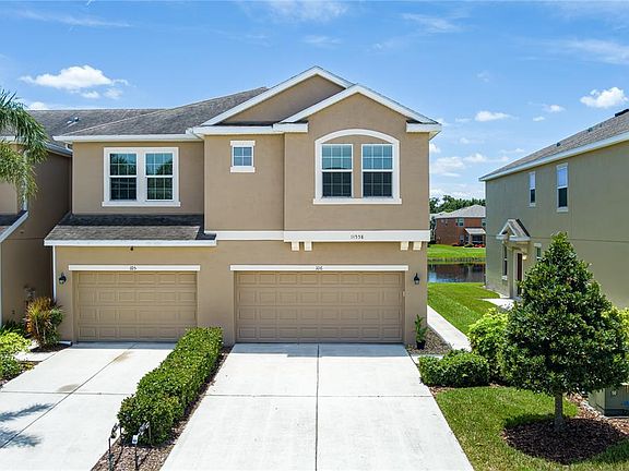 This end-unit 3-bedroom, 2.5-bath townhouse offers lake views in a gated, maintenance-free community with resort-style amenities. Features include a 2-car garage, screened lanai, and a spacious interior finished with ceramic tile and luxury vinyl flooring—no carpet. The kitchen features granite countertops, 42" cabinets, stainless steel appliances, including a brand-new microwave, a breakfast bar, and plantation shutters for a touch of elegance. There is a convenient half bath downstairs and an upstairs laundry closet. The primary suite overlooks the lake and offers a granite vanity, garden tub, and separate shower. Additional highlights include hurricane shutters and a low-maintenance lifestyle. The community offers a pool, clubhouse, fitness center, playground, and basketball court. An elementary school is conveniently located nearby, with additional schooling options throughout the area. You’re also just minutes from upcoming hospital facilities, a variety of shopping and dining destinations, and major hubs like St. Petersburg, Sarasota, and Tampa. This home blends comfort, convenience, and community—schedule your showing today!