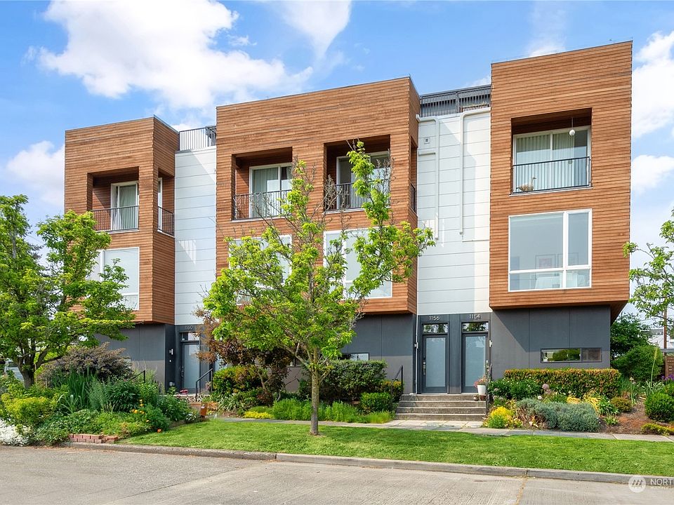 Right in the heart of Ballard! Quiet neighborhood feel yet easy access to area amenities, close to Gemenskap Park. Abundant natural light, tall ceilings, roomy floor plan, sweeping views & quality finishes. Main level features spacious kitchen with ample counter/cabinet space, dining area + large living room, guest half bath & private patio. First upper level in/c 2 bedrooms, full bath & spacious laundry room. Main bedroom suite on 2nd upper level in/c wall-to-wall closet, spacious & lux 5 piece bath w/ double vanity & balcony. Enjoy views of Mt Rainier, area fireworks, tippy-top of the Seattle skyline & twinkly lights at night from the spacious roof top deck. Radiant heat, AC + premium window coverings throughout + Off street parking spot.
