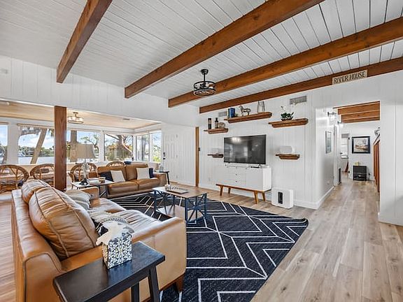 Vaulted wood-beam ceilings and full wall of windows with panoramic river views.