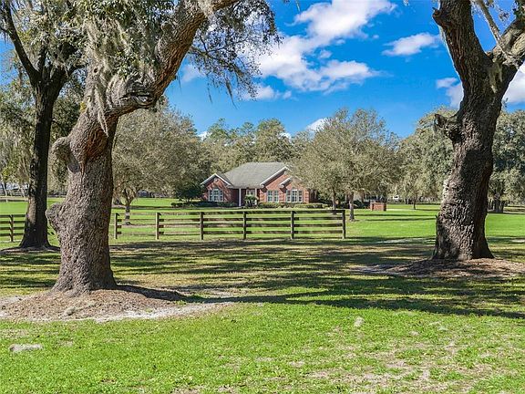 One or more photo(s) has been virtually staged. Welcome home to this exquisitely built 15 acre estate just minutes to Ocala shopping & dining and an easy 15 minute drive to The World Equestrian Center. Comprising two parcels with full perimeter fencing, established manicured pastures and dappled with live oaks. Through the automated double gate entryway, the tree lined drive leads to the home. The residence is nothing short of spectacular constructed of concrete block finished with red brick, icynene foam insulation and tasteful finishes throughout. Inside, the semi-open floor plan features tile flooring throughout the main areas, 10' ceilings with 11' trays, crown molding, 8' solid core doors, surround sound and plantation shutters across the front of the home. The kitchen boasts 42" cherry cabinetry with moldings, gorgeous granite countertops and stainless steel appliances. The adjacent dining space features a matching built-in hutch with display cabinets. Beyond the living and dining room is a sunroom with wet bar and oversized picture windows overlooking your captivating property. The split bedroom layout offers a spacious primary suite with ensuite bath featuring dual vanities, roman shower, garden tub, separate water closet and walk-in closet with built-ins. Additionally, there is a tiled study with a closet and two bedrooms - one with a full ensuite bathroom and one with an adjacent full bathroom. The laundry room boasts a plethora of storage and leads to the garage featuring an oversized 18' wide door and storage room. This property also features a commercial grade, insulated, metal building large enough to store all of your toys including RVs with two power hookups, a 12' wide by 14' high roll up door, water and sewer. There is also a hobby room with a bathroom & kitchenette and a covered bay along one side wide enough to accommodate vehicles and trailers. This spectacular property could easily be an incredible equestrian estate. You must experience this property in person to appreciate the true beauty and functionality. Please enjoy the video walkthrough, 3D tour and schedule your private showing before it's too late!
