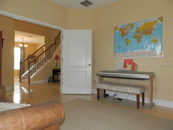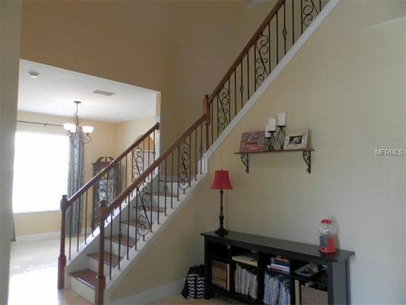 HOME SWEET HOME! CHECK OUT this 4 bedroom, 2/1 bathroom single family home in the beautiful community of Panther Trace. As you approach the front door, you are met with a lovely covered porch, creating the perfect location for starting your day with a hot cup of coffee or tea. As you enter the home, you are welcomed into the foyer with sky-high ceilings, gorgeous wood stairs with stunning wrought iron and wood banister stair railing. Striking travertine flooring flows throughout the lower level of the home, leading into the office with french doors that open up the living space. The open concept living room leads into the breakfast nook area and into the kitchen with large windows filling the home with natural lighting.  The kitchen provides ample storage space with all wood cabinetry, packed with stainless steel appliances. A formal dining room is perfect for hosting dinner parties or can easily be converted into an additional living space. Completing the lower level is a half bathroom. Upstairs the master retreat will not let you down, an en-suite with dual sinks, soaking tub, walk-in shower, and his & her walk-in closets. There are three additional large sized secondary bedrooms upstairs, with spacious closets, and a full-sized bathroom. The fenced in backyard features a large tiled screened in lanai that is perfect for entertaining family and friends. This home is located in a WONDERFUL community with resort style amenities to include luxury-style swimming pool, tennis courts and a playground. COME SEE THIS HOME TODAY! UPGRADES AND HIGHLIGHTED FEATURES INCLUDE: Hot water heater 2020, custom garage storage, dishwasher 2017, microwave 2017, landscaping & sprinkler system in the backyard, kick-plates, and new screen door on the lanai, new carpeting upstairs 2016, paint in master bedroom & bathroom 2016, new ceiling fans in the upstairs rooms, all new smoke detectors & carbon monoxide detectors 2019 less than 1-year-old.