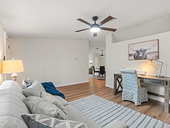 This recently remodeled 2002 built 4 bed 2 bath manufactured home is ready and waiting for you to call home! Enjoy your large primary suite walk in closet, and spacious bath with soaking tub and separate shower. Ample space inside and out to relax or entertain this property offers double living areas a large front porch and above ground pool to enjoy with friends and family on sunny days! The homes updates include new lvp in common areas and primary bath, new carpet, all new interior fans and light fixtures, refinished cabinets and countertops in kitchen and bathrooms, new cabinet hardware, new plumbing fixtures, stainless appliances with new fridge and range, all fresh interior paint, beadboard and shiplap accent walls and more! With location convenient to 295 and 95 you can get anywhere in Jacksonville in no time! Detached shed, water softener and irrigation sold as is where is. FHA SEASONING UP 10/6/2025