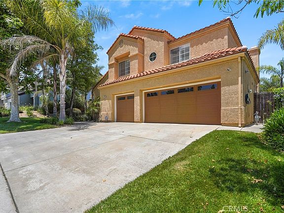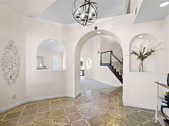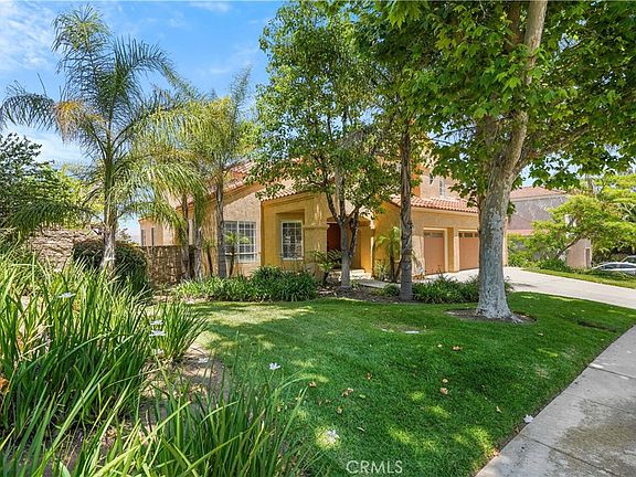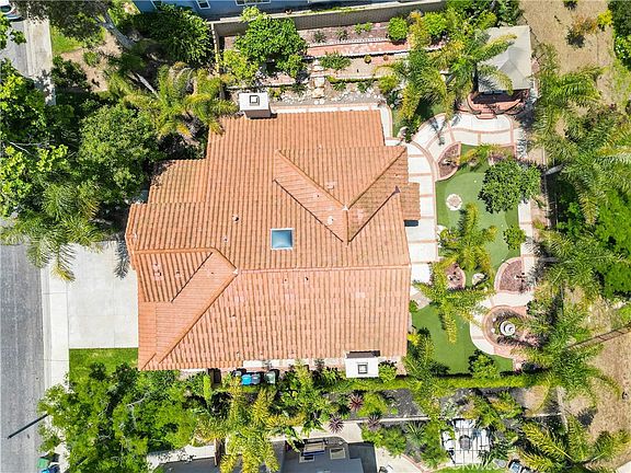 This home is move-in ready, with spacious rooms, natural light, and Spanish architectural flare that will win your heart. With 5 bedrooms, 5 baths and over 3600 sq. ft., you’ll find bright white plantation shutters throughout, tile flooring, and rich dark hardwood floors. A beautiful grand entrance offers site-lines of the wide staircase and soaring ceilings. Magnificent kitchen with adjoining breakfast area, swathed in light from double sliding doors, has abundant cupboard space, granite countertops and backsplash, island with modern chandelier and newer stainless steel appliances. The family room has a fireplace, recessed lighting, and large windows overlooking the lovely yard. For formal meals, there’s a separate large dining room with view ceilings and lots of natural light. The 1st floor also has a fantastic bar, newly remodeled powder room, and a large bedroom/office with attached ¾ bath. The 2nd floor features a large landing with a skylight & plentiful storage. Double doors open to the primary bedroom with sitting area. Large windows afford you a stunning view over the neighboring rooftops to city lights for miles. Walk-in closet with ample built-in shelving and drawers. The primary en suite with its double sinks, recessed lighting, separate shower and tub with overhead chandelier will be your new favorite oasis. 3 additional bedrooms all with generous mirrored double sliding closets and 2 more attached baths. This thoughtfully updated home sits on over a 9700 sq. ft. lot adorned with palm trees, a three-hole putting green, a raised pergola for gazing out over the scenic panorama, ribbons of red brick, beautiful pathways, raised planters, and lush landscaping. Enjoy a 3-car garage with direct access via laundry room, lovely street frontage, and 2 community pools + rec. room.
