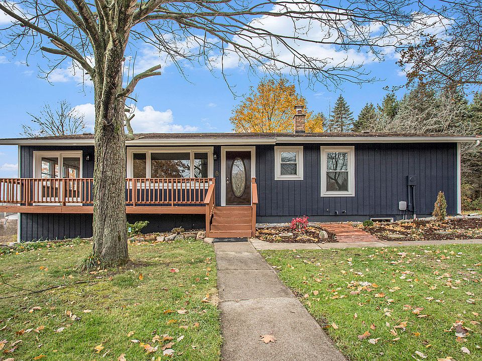 Marcellus ranch walkout w/acreage on the Rocky River known for it's great hunting & fishing including bass, bluegill & brown trout to name a few. Beautifully set on over 11 acres this 3 bd, 2 bath home has over 2700 sf of finished living space. 2.5 garage. 32 x 48 pole barn w/electric and lean-to for extra storage . Open floor plan offers elevated panoramic views from much of the home. Hickory hand-scraped hardwood throughout main floor. Huge living/dining area w/bay window. Kitchen has stainless appliances & hickory countertops & butcher block. Freshly renovated bath. Walkout level has additional bedroom with potential 4th bedroom, full bath, sunroom/office, storage room, giant recreation room all overlooking 11 stunning acres with walking trails leading to the Rocky River. Call today for your private showing to see everything this home has to offer-both indoors & out!