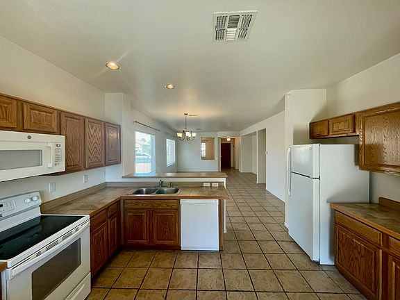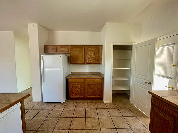 The open layout seamlessly connects the spacious living room, dining area, and kitchenperfect for entertaining or everyday living. The kitchen showcases classic oak cabinetry, tile countertops, a full appliance package including a refrigerator, microwave, and range, along with a pantry and easy access to the covered patio.