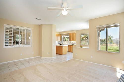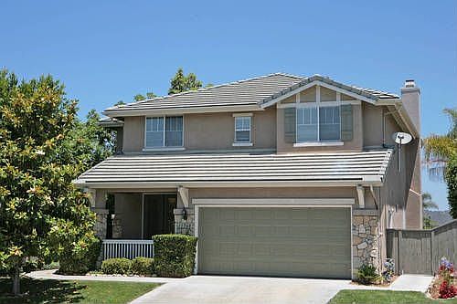 This bright and open five-bedroom home offers spaciousness and comfort set against a backdrop of natural canyon open space. Situated on a rarely available canyon rim lot, enjoy distant, panoramic views of surrounding hills and evening lights. Formal and informal spaces flow. Plantation-style shutters separate the formal living/dining areas and the inviting family room with cozy gas-fed fireplace. The cheery eat-in kitchen offers a casual dining nook, a center island, gleaming white tile counters with full-height backsplash and custom tile accents, and large windows plus sliders to the rear yard. The large rear yard is both private and peaceful. Views of the distant mountains are unobstructed, and the lush, manicured lawn provides opportunity for play. One bedroom and a full bath are conveniently located downstairs. The bedroom is currently configured as an office (no closet), and includes two glass-front, double-door entries, one of which is a private entrance from outside through the charming covered porch. Upstairs, the large master suite includes a retreat and a private view balcony. The adjoining master bath includes dual basins, a separate shower and soaking tub, and a roomy walk-in closet. Three additional bedrooms are located upstairs, one with a walk-in closet. Other special features include new plush carpeting, fresh custom-color paint, security system, air conditioning plus ceiling fans, a convenient upstairs laundry room with sink and cabinets, horizontal blinds, CAT 5 wiring throughout, and attached two-car garage with storage shelving. Crestview residents enjoy proximity to school and parks, shopping, dining and transportation.