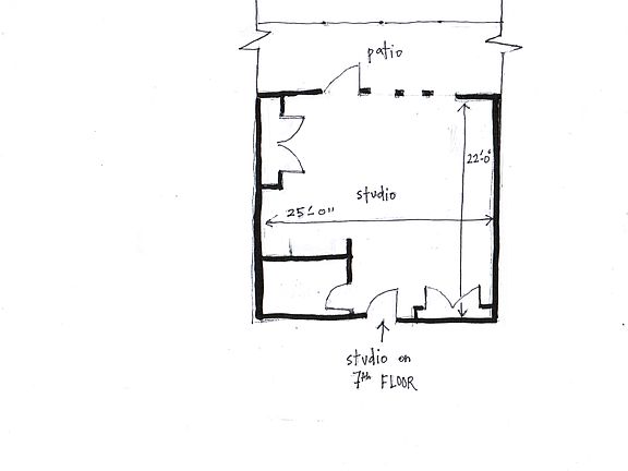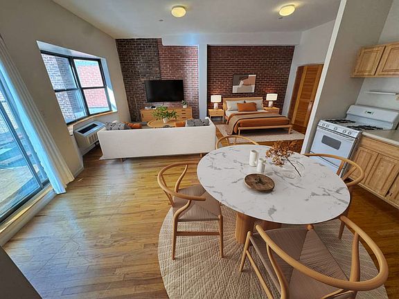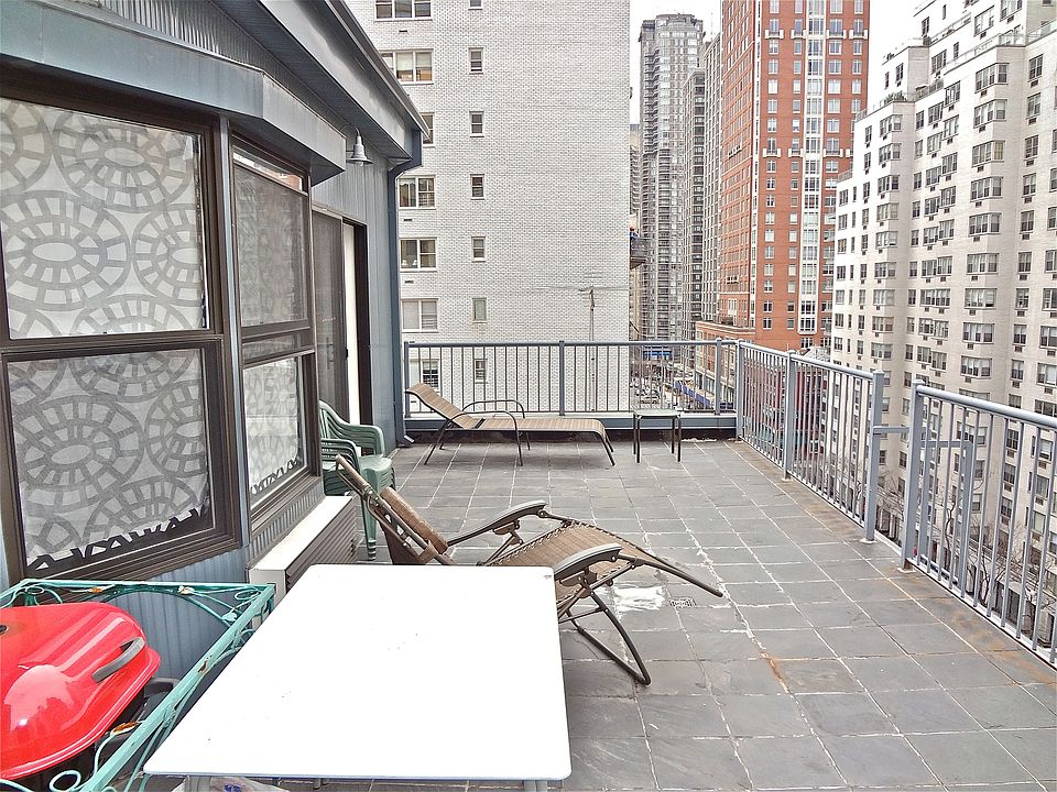 Top-floor, corner loft studio with a massive private terrace. Features include soaring ~12' ceilings, exposed brick, two large closets, and full-size appliances. This is the only apartment on the top floor a truly unique home with character and space.