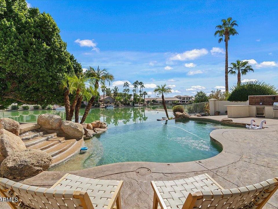 Versatile basement retreatWaterfront residenceInfinity-edge poolHigh-end finishesSpacious patioResort-style settingGourmet kitchen