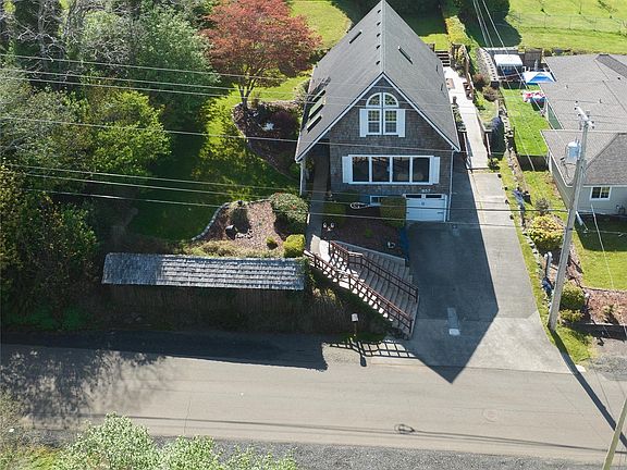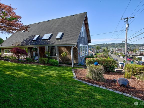A Very Charming, one-of-a-kind, View home. Located on Summit Hill overlooking the Willapa River on the outskirts of Raymond. Terraced landscaping draws your eye to the weathered cedar shakes and white trim. Private patio & deck in back with large yard. Quaint pond and mature plants. The interior boasts of high shiplap detailed ceilings, crown moldings, natural cedar wainscoting and some leaded glass. Rustic hardwood floors throughout much of the home. New kitchen built in the vintage style of the home. Granite island. Wood front refrigerator, microwave undermount, New heat pump, AC and new garage door. Seller is also offering a home warranty with the purchase. 2 lots across the road included. Buyer verify exact lot lines with county.