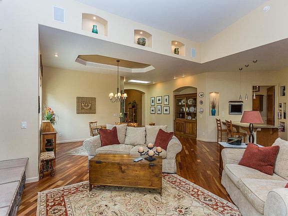 One-owner meticulous 2nd home, effective age is 1-1/2 years! Barenz custom built w/ every attention to detail. Brazilian cherry floors, great room offers 13' stone fireplace and coiffured ceiling dining area. Tiled foyer is framed w/ opaque glass. Chef's kitchen with custom made island w/ cookbook shelves & storage, granite counter tops, tile w/ silver inlaid back splash. Laundry room is loaded with cabinets/pantry, trash compactor & utility sink. All bdrms are split, master has deck access. Hunter Douglas remote pleated shade over tub, toe warmers at sinks & French chandeliers. Large family room downstairs w/bdrm, bath & UNFINISHED heated 612 sq. ft flex room w/lg windows, ideal studio, workshop, office.