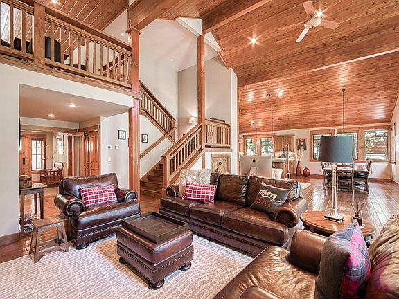 The open floor plan flows naturally into the dining and kitchen areas, enhancing the home's inviting, social atmosphere. A lofted second-story landing overlooks the space, adding to the sense of openness while maintaining a cozy mountain lodge feel.
